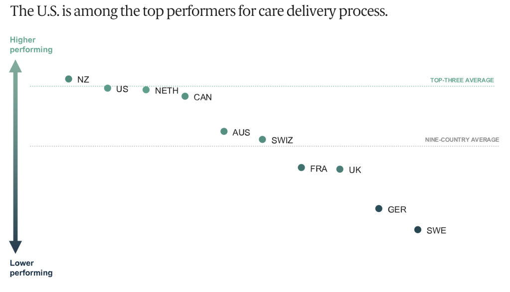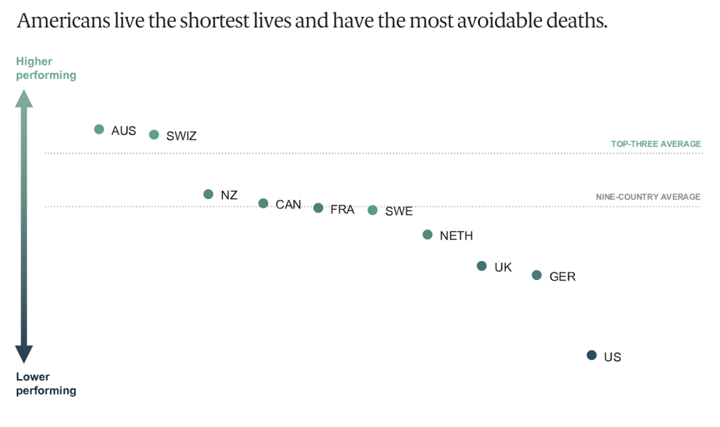 - Path Forward: Improvement is feasible if the U.S. addresses insurance shortfalls, limits patient expenses, and rebuilds primary care systems, aligning closer to global best practices [and changes the focus from profit-based to care-based.]