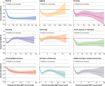 • Most individual activities (except swimming) were associated with lower all-cause mortality in a non-linear dose-response way: more activity gave more benefit up to a point.