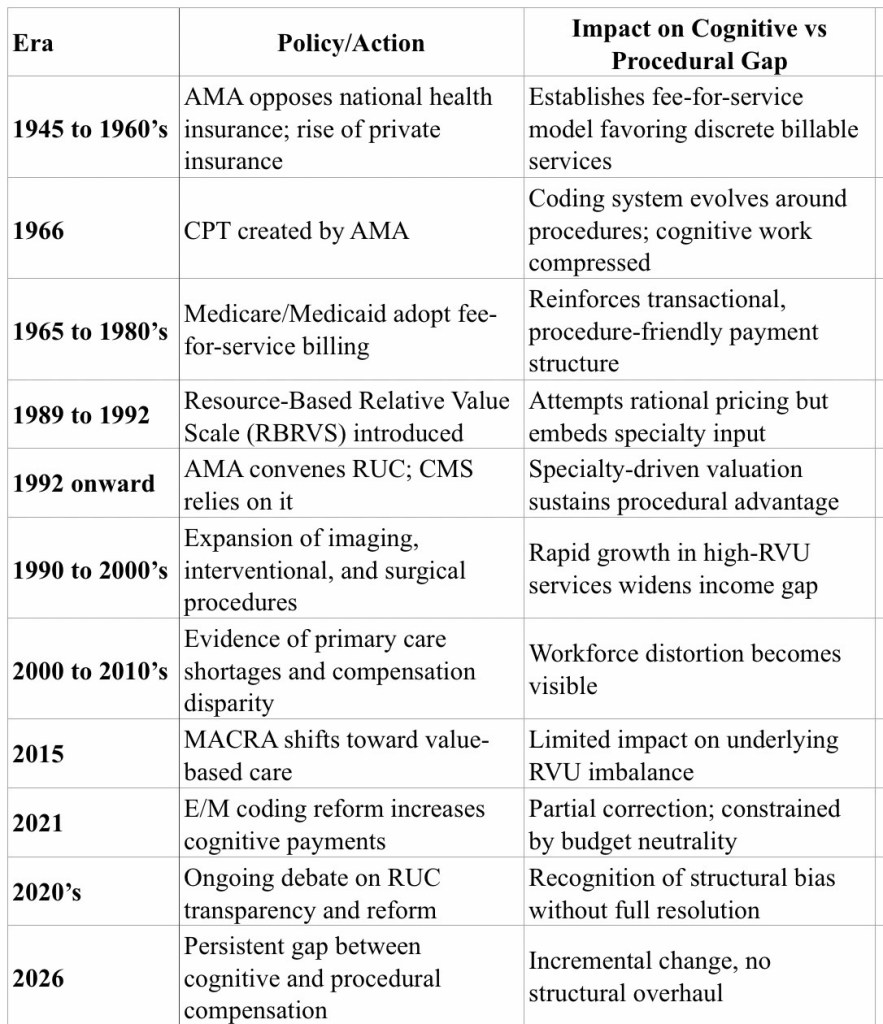 Procedures retained high valuations, often based on legacy assumptions about time and intensity. Cognitive care remained undervalued, even as patient complexity increased. Over time, this created a widening gap in compensation, influence, and workforce distribution.