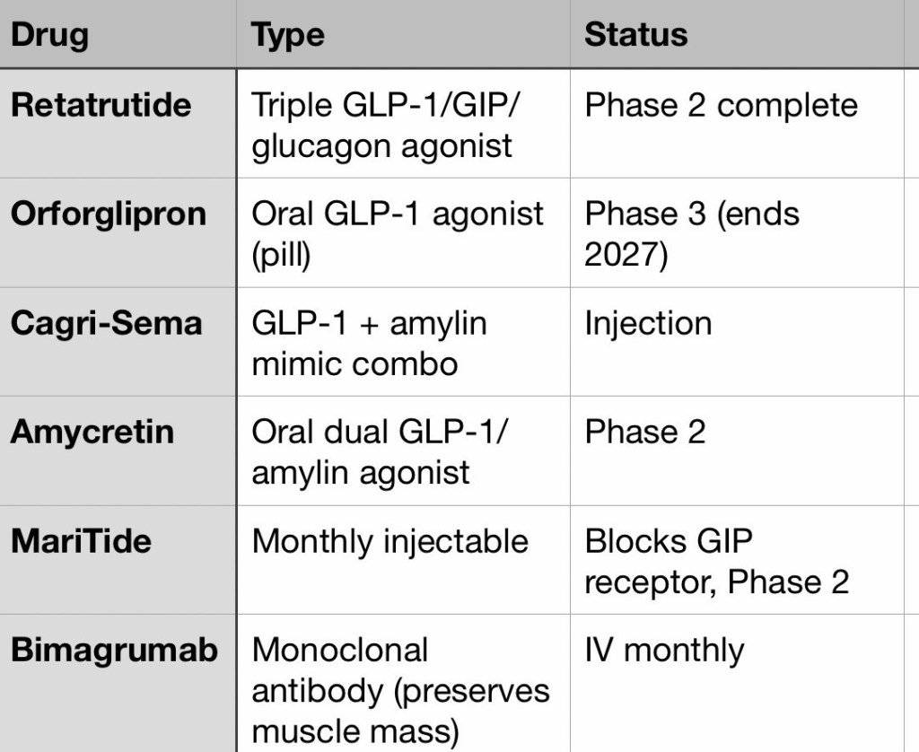 The move toward oral formulations (orforglipron, danuglipron, amycretin) and monthly injectables (MariTide) could dramatically change adherence and access.